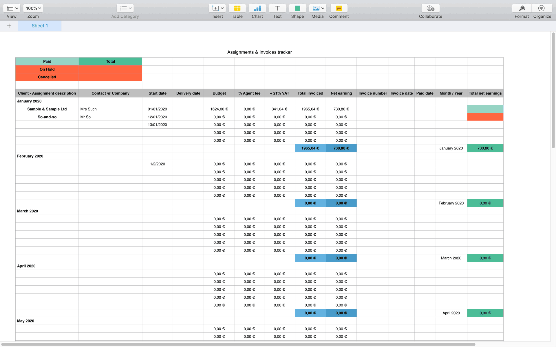 A free spreadsheet template for Apple Numbers, to help you keeping track of your past and future invoices and clients payments.