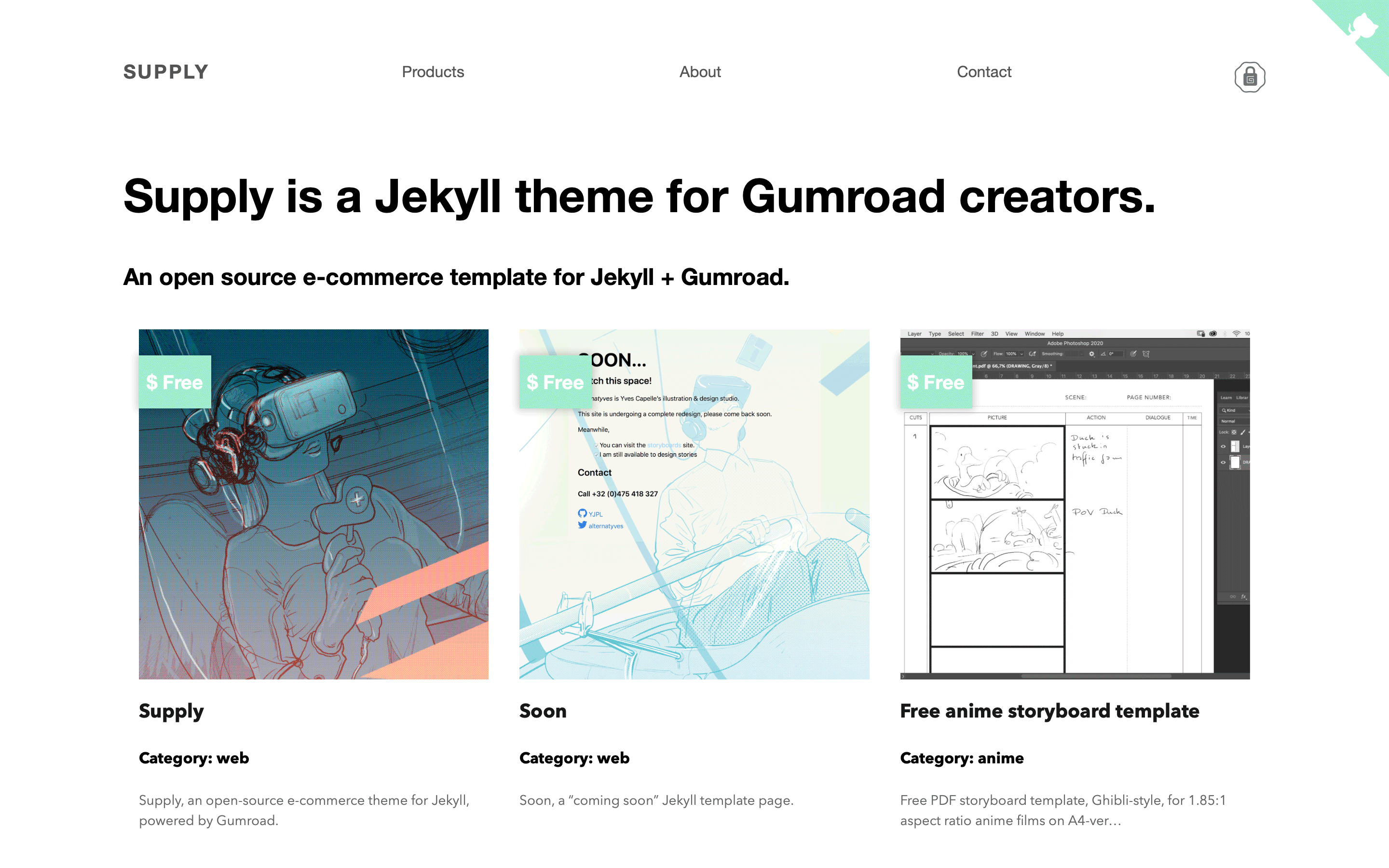 Supply, an open-source e-commerce theme for Jekyll, powered by Gumroad.